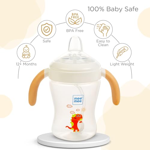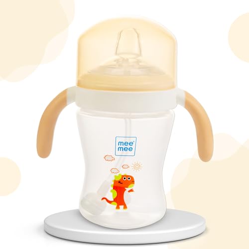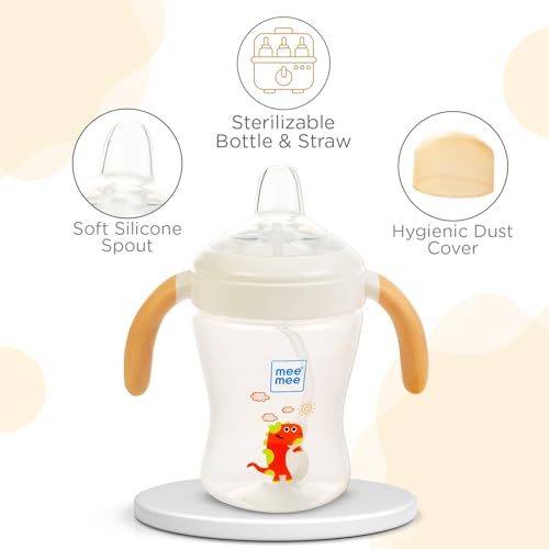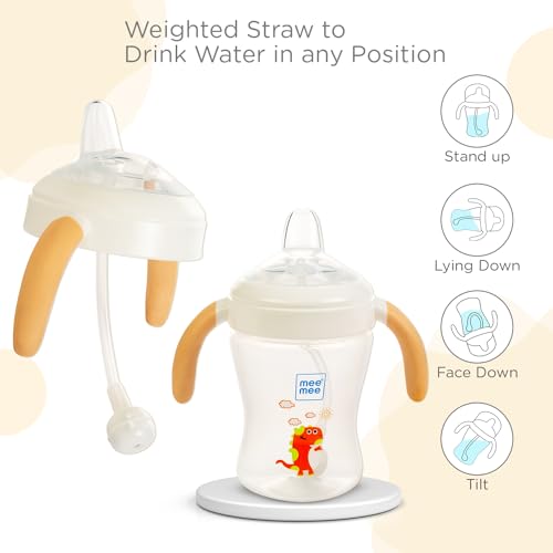 Mee Mee Sippy Cup designed to make feeding time a breeze for both parents and babies alike. Featuring a soft silicone spout and a weighted straw this cup allows your little one to drink water comfortably in any position. The hygiene dust cover ensures cleanliness on the go while the sterilizable bottle and straw make maintenance hassle-free. With an ergonomic handle for easy grip and a lightweight design it's perfect for little hands to hold. Plus the wide neck makes cleaning a breeze. And of course it's BPA-free for your peace of mind.