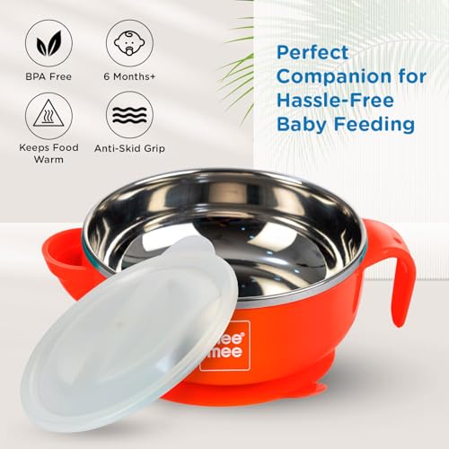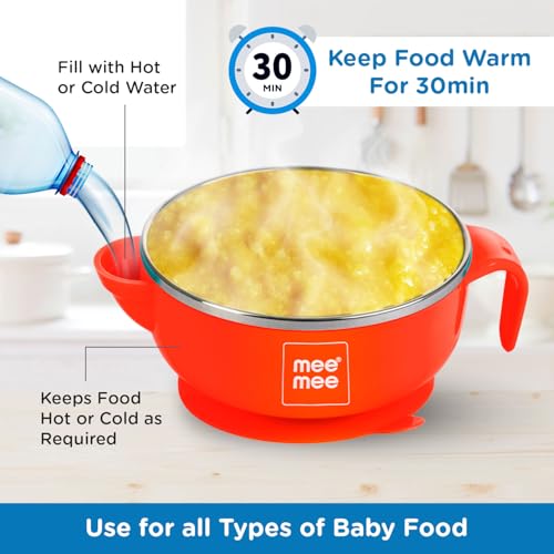 Mee Mee Stay Warm Baby Steel Bowl with Suction Base, Red(Pack of 1)