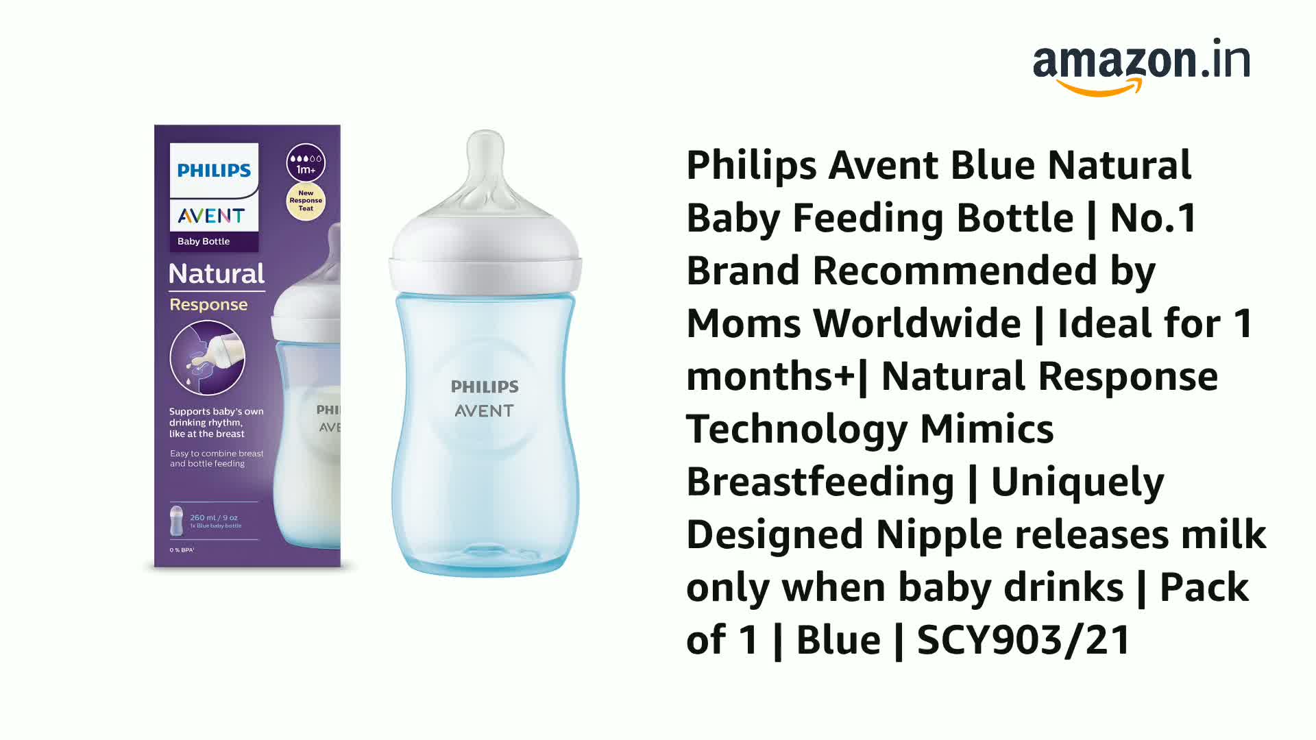 Philips Avent Blue Natural Baby Feeding Bottle | No.1 Brand Recommended by Moms Worldwide | Ideal for 1 months+| Natural Response Technology Mimics Breastfeeding | Uniquely Designed Nipple releases milk only when baby drinks | Pack of 1 | Blue | SCY903/21