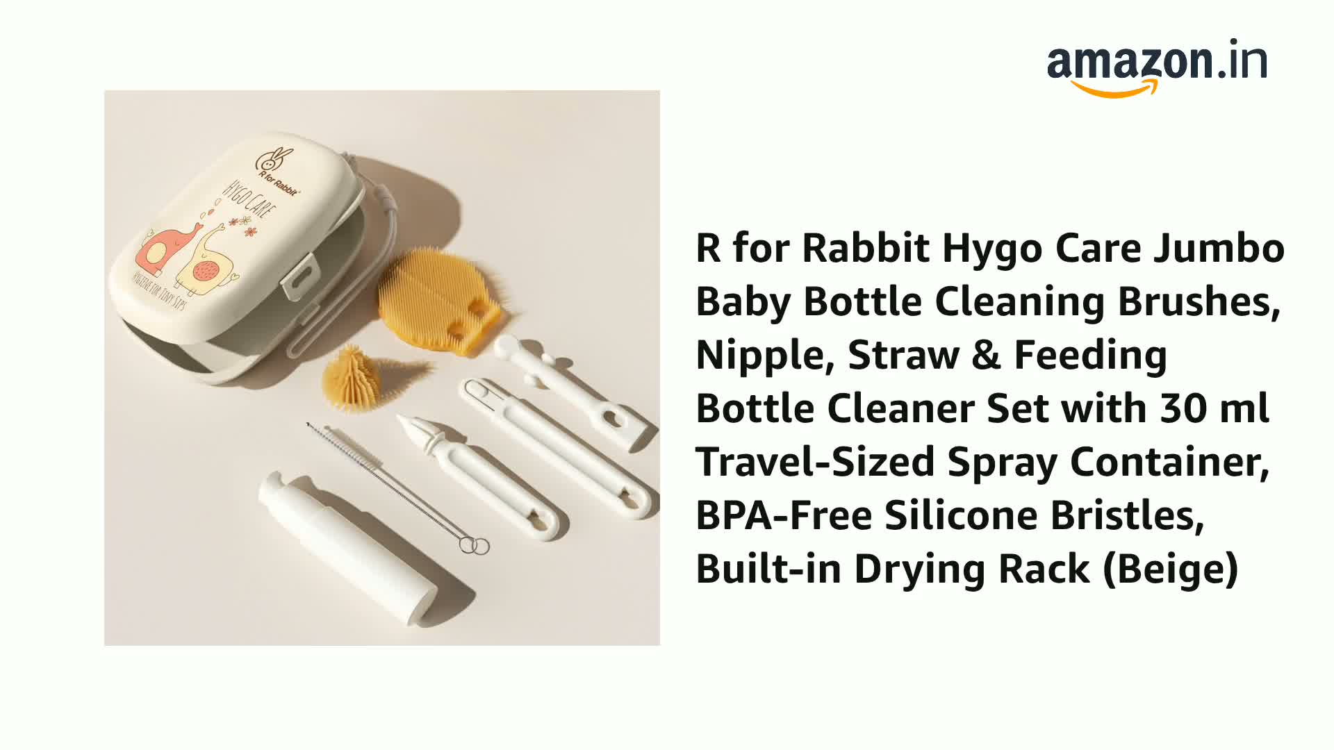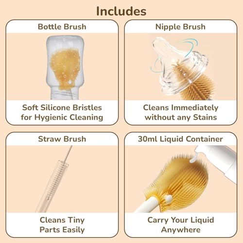 R for Rabbit Hygo Care Jumbo Baby Bottle Cleaning Brushes, Nipple, Straw & Feeding Bottle Cleaner Set with 30 ml Travel-Sized Spray Container, BPA-Free Silicone Bristles, Built-in Drying Rack (Beige)