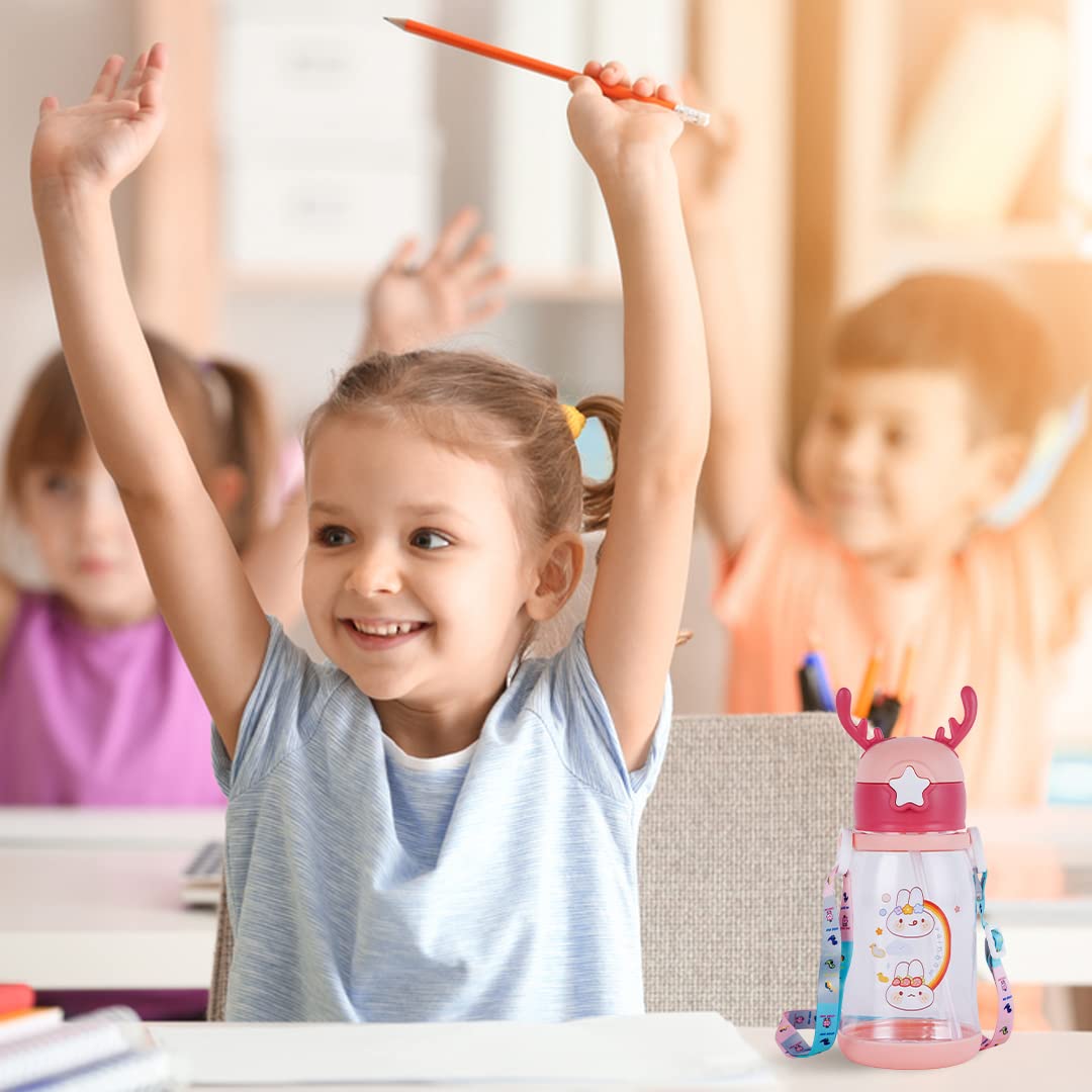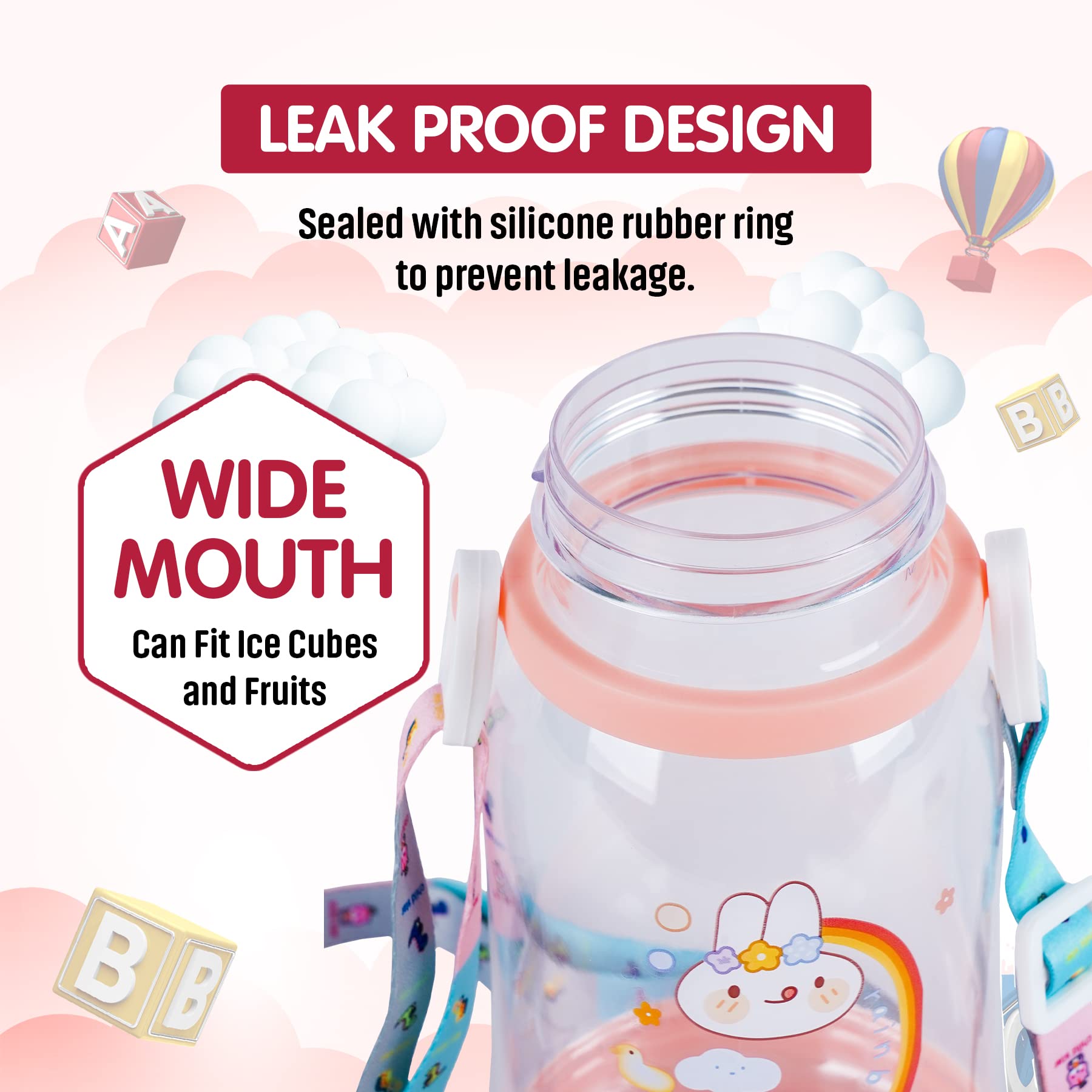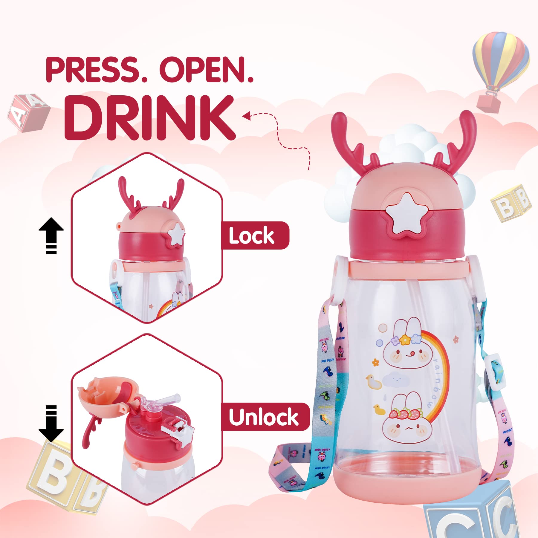 SHOPPOFOBIX Kids Water Bottle with Straw Water Bottle With Straw & Cartoon Design and Shoulder Strap for Students and Children Boy girl 600ml (Pink)
