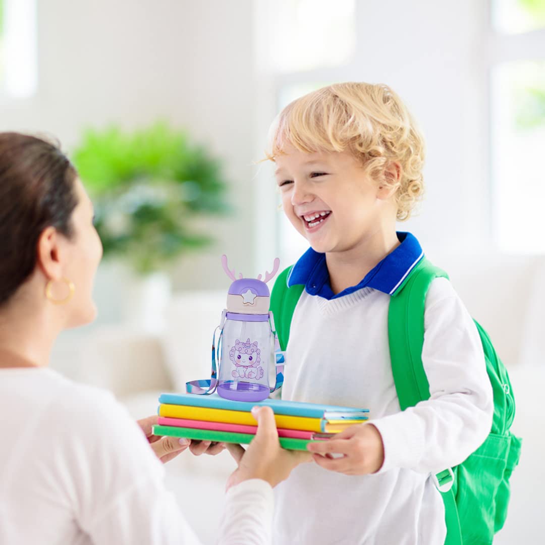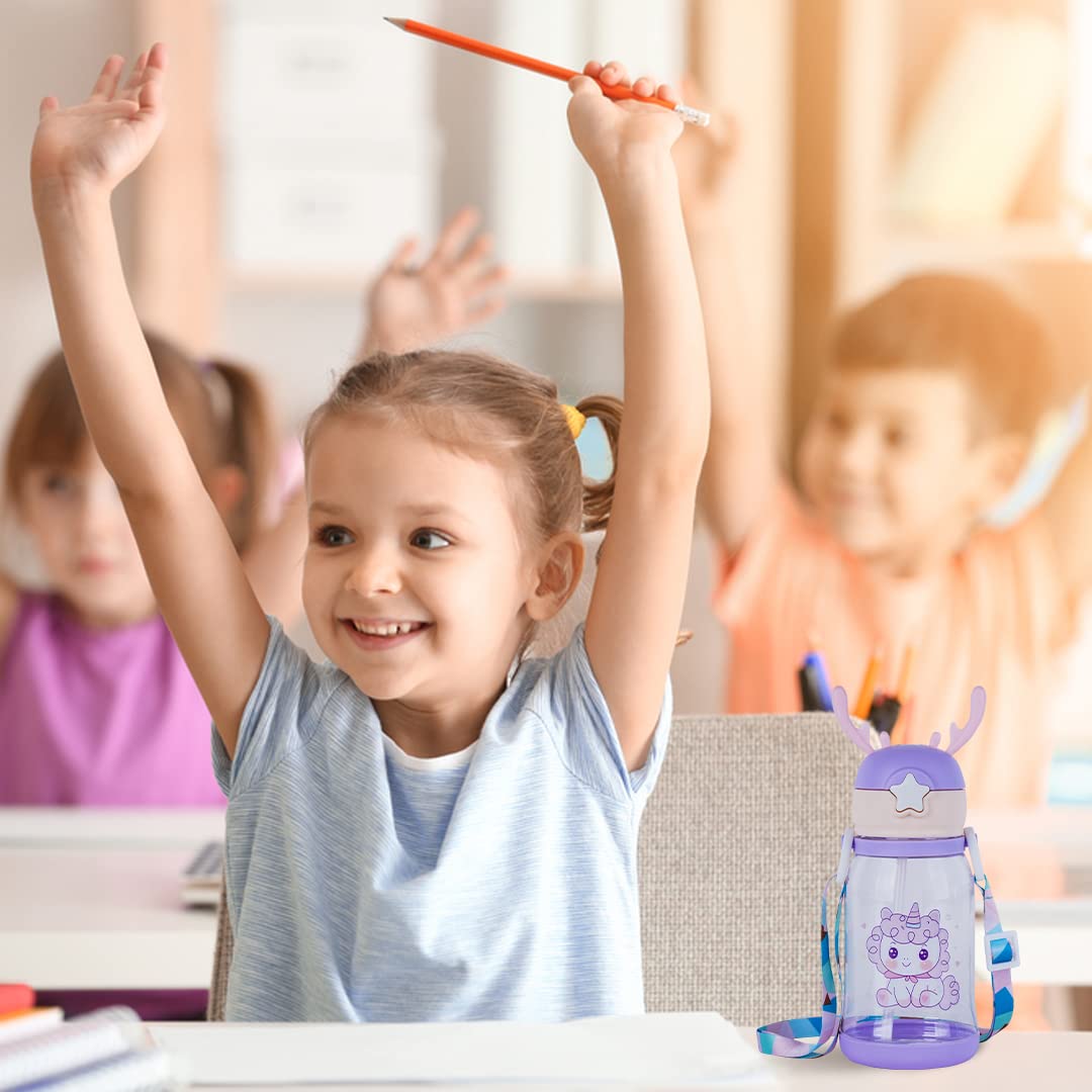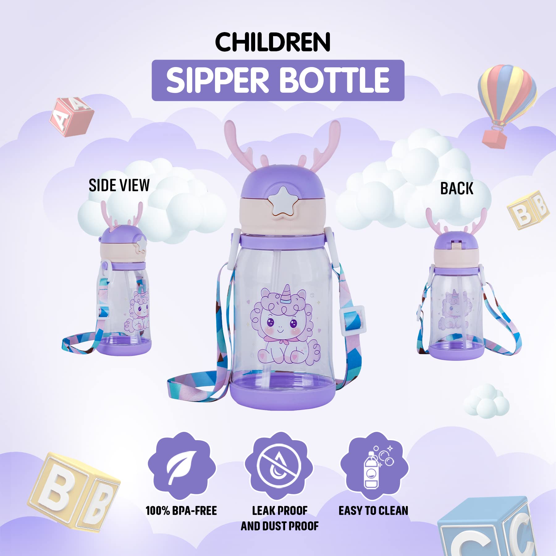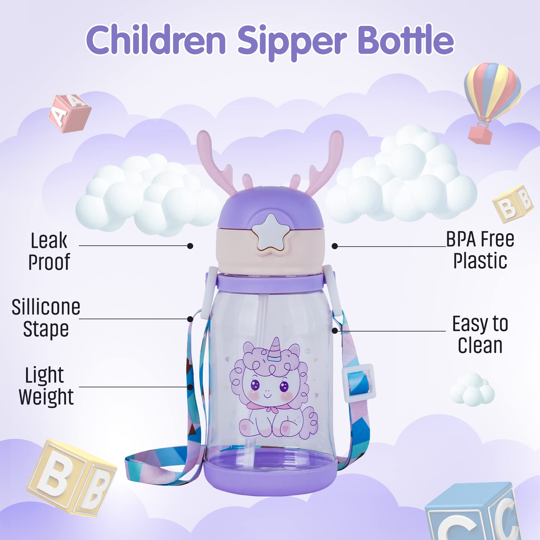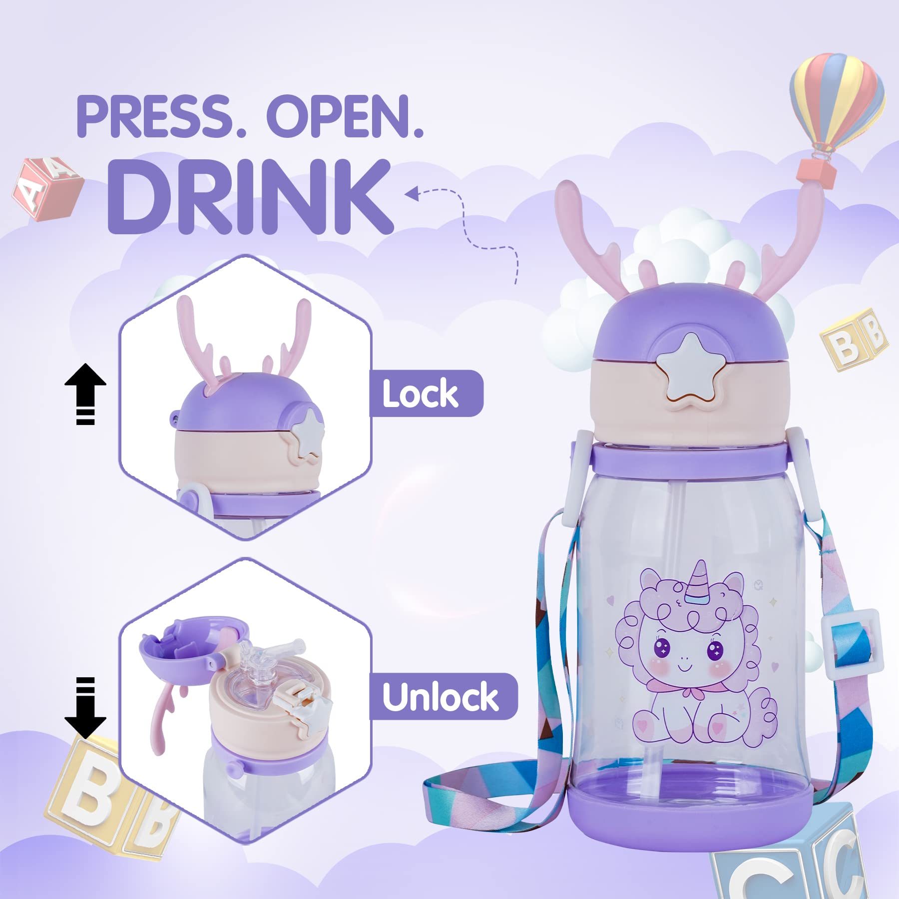 SHOPPOFOBIX Plastic Kids Water Bottle With Straw Water Bottle With Straw & Cartoon Design And Shoulder Strap For Students And Children Boy Girl 600 milliliter (Purple)