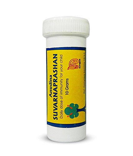 Anudina Swarnaprashana contains Swarna Bhasma (Gold Bhasma) Brahmi (Bacopa monnieri) Vacha (Acorus calamus) Trikatu (Pippali Pepper & Ginger) Aragwadha (Cassia fistula) Shankhapushpi(Convolvulus pluricaulis) Yastimadhu (Glycyrrhiza glabra) Tulasi (Ocimum sanctum) Guduchi (Tinospora cordifolia) and Amalaki (Emblica officinalis). It is important to remember that Swarna bhasma is processed in various ways to ensure efficacy and safety. Anudina Swarnaprashana uses âRasamaaritha Swarna bhasmaâ which is the best processed Gold bhasma and known for its efficacy (has more than 94% of Gold) and unmatched safety. The Gold bhasma and other herbs are measured precisely and processed to form Anudina Swarnaprashana powder which is easily absorbable and highly potent.