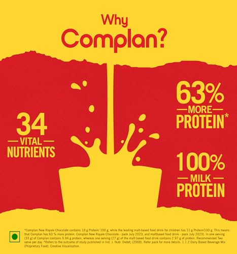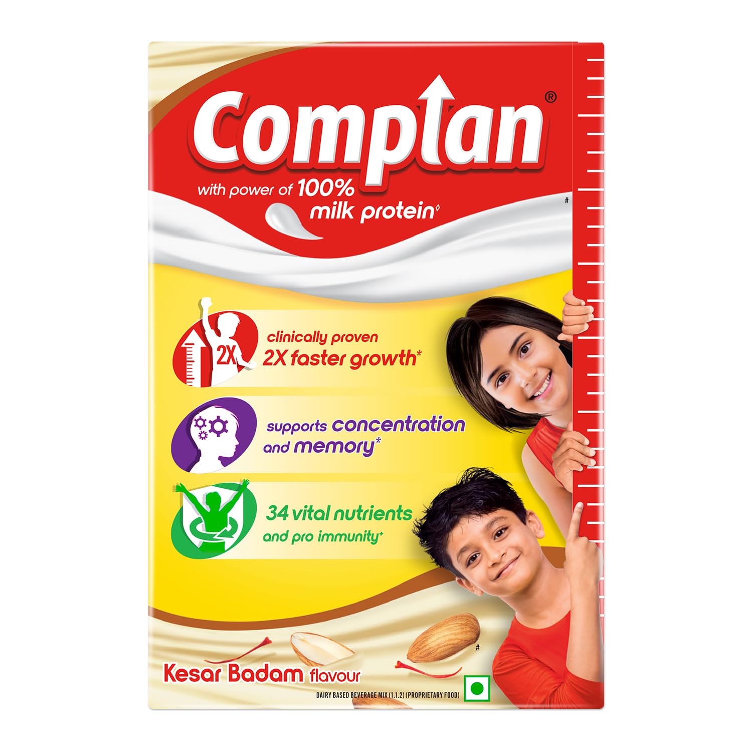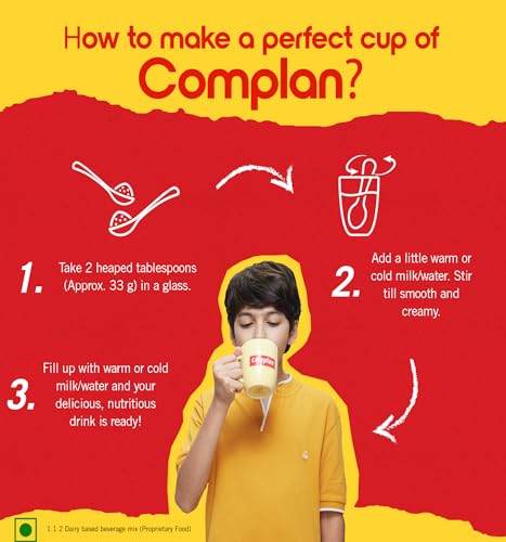 Complan is a Dairy-based Beverage Mix' a Nutrition drink powder scientifically designed to meet the nutritional needs of growing children. Its Kesar Badam Flavour is a nutritious drink with a delicious taste that your kid will enjoy. It provides essential nutrients including 100% milk protein vital for their development. Complan contains 63% more protein (per 100g and per serve basis) than regular Malt-based Food Drink powder. Its formulation with 34 key nutrients such as Vitamin D2 calcium Zinc etc. is designed to support overall growth and functioning. Complan is clinically proven to support 2X faster growth and supports memory and concentration. This nutrition drink for kids contains essential nutrients like iodine iron zinc etc. that are known to support brain development and functioning. The pro-immunity nutrients like Vitamin A Vitamin C etc. support immune function. Serve this delight twice a day (33g x 2) as a part of your child's balanced diet. It can be served in two delicious ways both as a hot drink and a cold drink. Give your child the Complan nutrition.