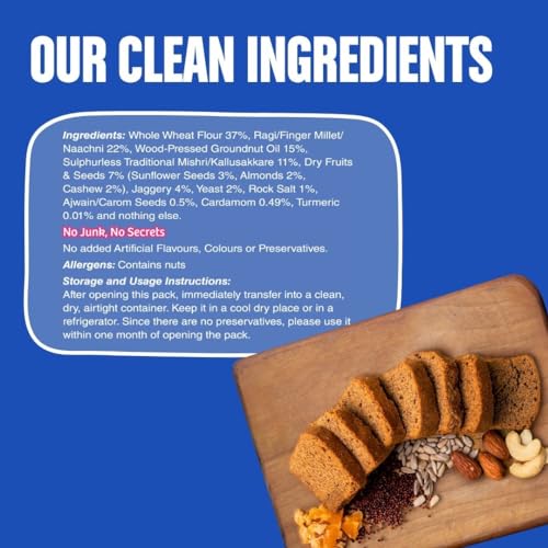 INGREDIENTS : Whole Wheat Flour 37%Rafi/Finger Millet/Naachni 22% Wood-Pressed Groundnut Oil 15% Sulphurless Traditional Mishri/Kallusakkare 11% Dry fruits & seeds 7% (Sunflower Seeds 3% Cashew 2% Almonds 2%) Jaggery 4% Yeast 2% Rock Salt 1% Ajwain/Carom