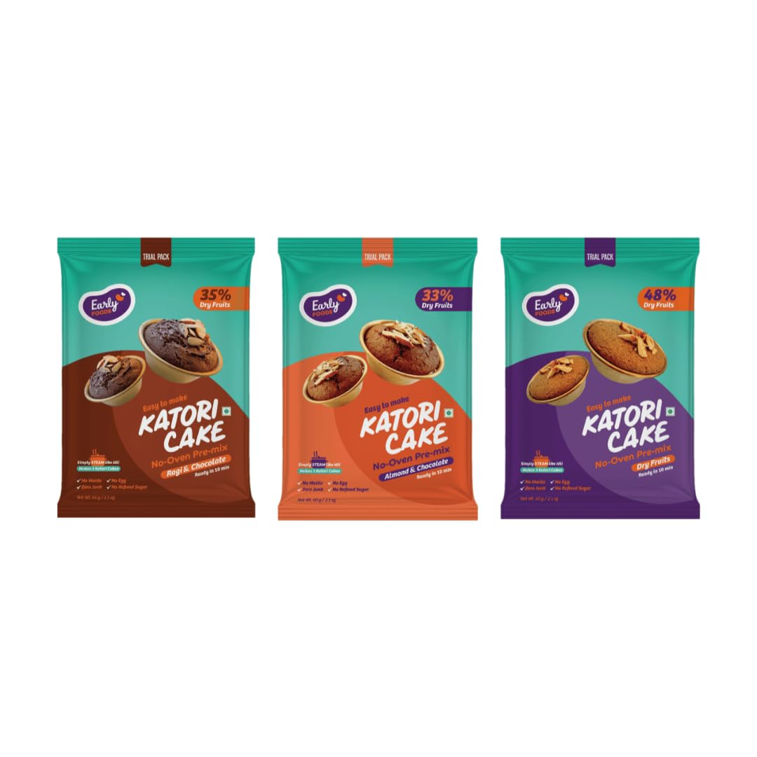 Early Foods : Trial Packs Combo of 3 Katori Cake Mix(Ragi Choco Dry Fruits & Almond Choco)| No Maida or Refined Sugar Free Cake Mix | Chocolate Cake Mix | Eggless Cake Mix | No Oven or Microwave Steamer Cake Mix 60 gms x 3