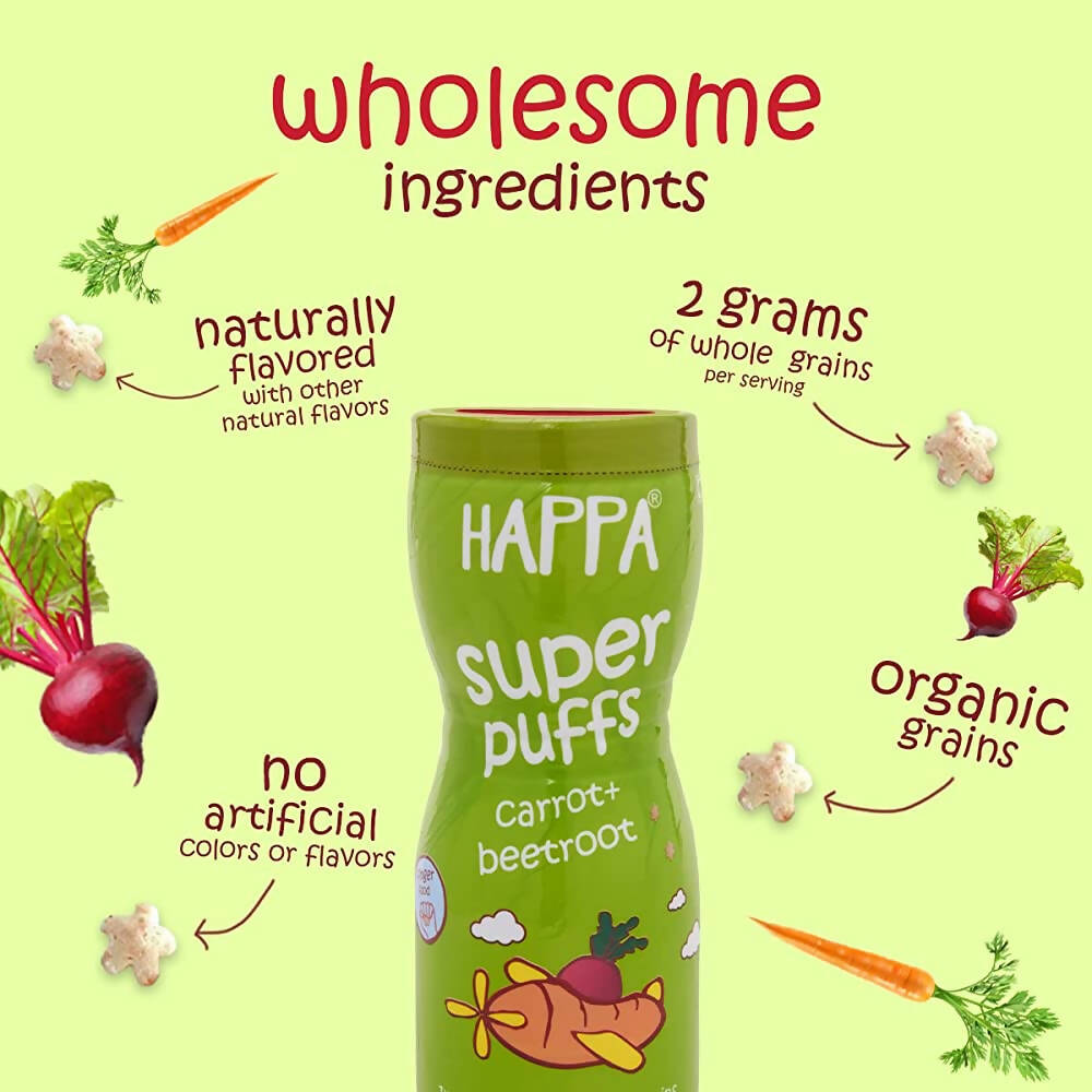 Happa Multigrain Carrot & Beetroot Melts Super Puffs (8 Months+)About the product:Happa Super Puffs are the perfect snack for your little one! These yummy treats come in a variety of delicious flavors like banana, strawberry, and blueberry etc. They are made with natural ingredients and crafted by a dad who wants the best for his baby. These puffs are not only delicious but also nutritious too. They are also easy for little hands to pick up and hold, promoting fine motor skill development and providing a perfect option for teething babies and their melt in the mouth texture makes it easier for the baby to consume. And like all Happa products, these super puffs are free from artificial preservatives and colors. So, if you're looking for a tasty, nutritious, and easy-to-handle snack for your baby, Happa Super Puffs are the way to go! Snack on them too! We have a wide variety of flavors to give your baby choices.Legal Disclaimer: Product images are for illustrative purposes only. Images/packaging/ labels ma
