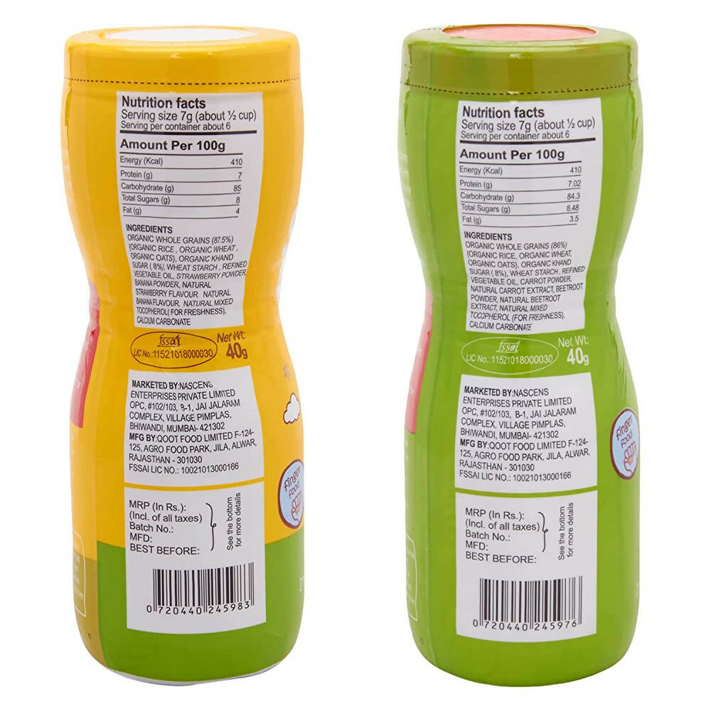 Happa Organic Multigrain Strawberry Banana & Carrot Beetroot Melts Super Puffs Combo (8 Months+)About the product:Happa Super Puffs are the perfect snack for your little one! These yummy treats come in a variety of delicious flavors like banana, strawberry, blueberry, etc. They are made with natural ingredients and crafted by a dad who wants the best for his baby. These puffs are not only delicious but also nutritious too. They are also easy for little hands to pick up and hold, promoting fine motor skill development and providing a perfect option for teething babies and their melt-in-the-mouth texture makes it easier for the baby to consume. And like all Happa products, these super puffs are free from artificial preservatives and colors. So, if you're looking for a tasty, nutritious, and easy-to-handle snack for your baby, Happa Super Puffs are the way to go! Snack on them too! We have a wide variety of flavors to give your baby choices.Combo Contents:Strawberry + Banana 40gmCarrot + Beetroot 40gmLegal Disclaimer: Product images are for illustrative purposes only. Images/packaging/ la