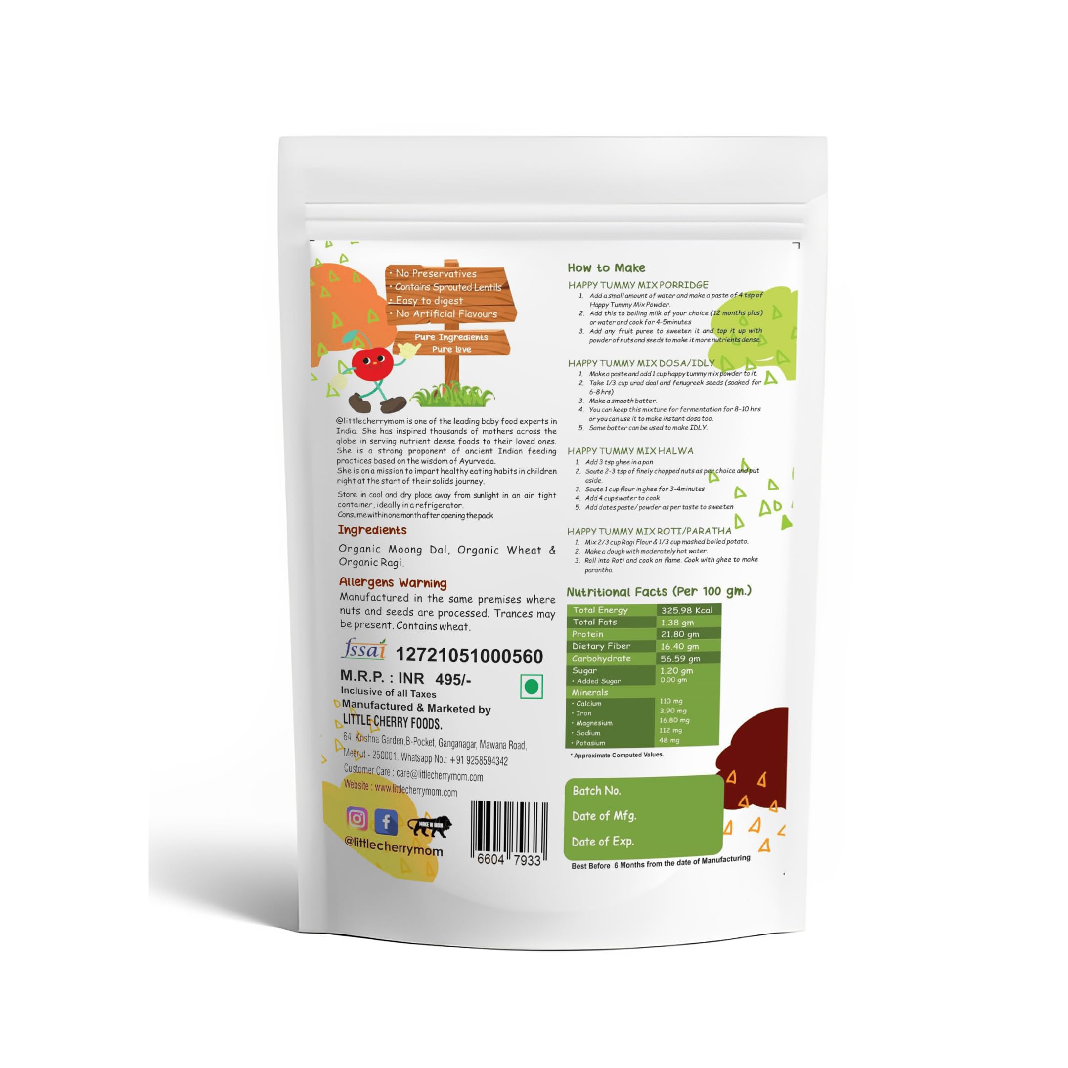 Littlecherrymom’s Happy Tummy Mix for babies contains in it the goodness of Ragi, Wheat and Moong Dal. This magical amylase blend promotes a healthy and happy gut health.