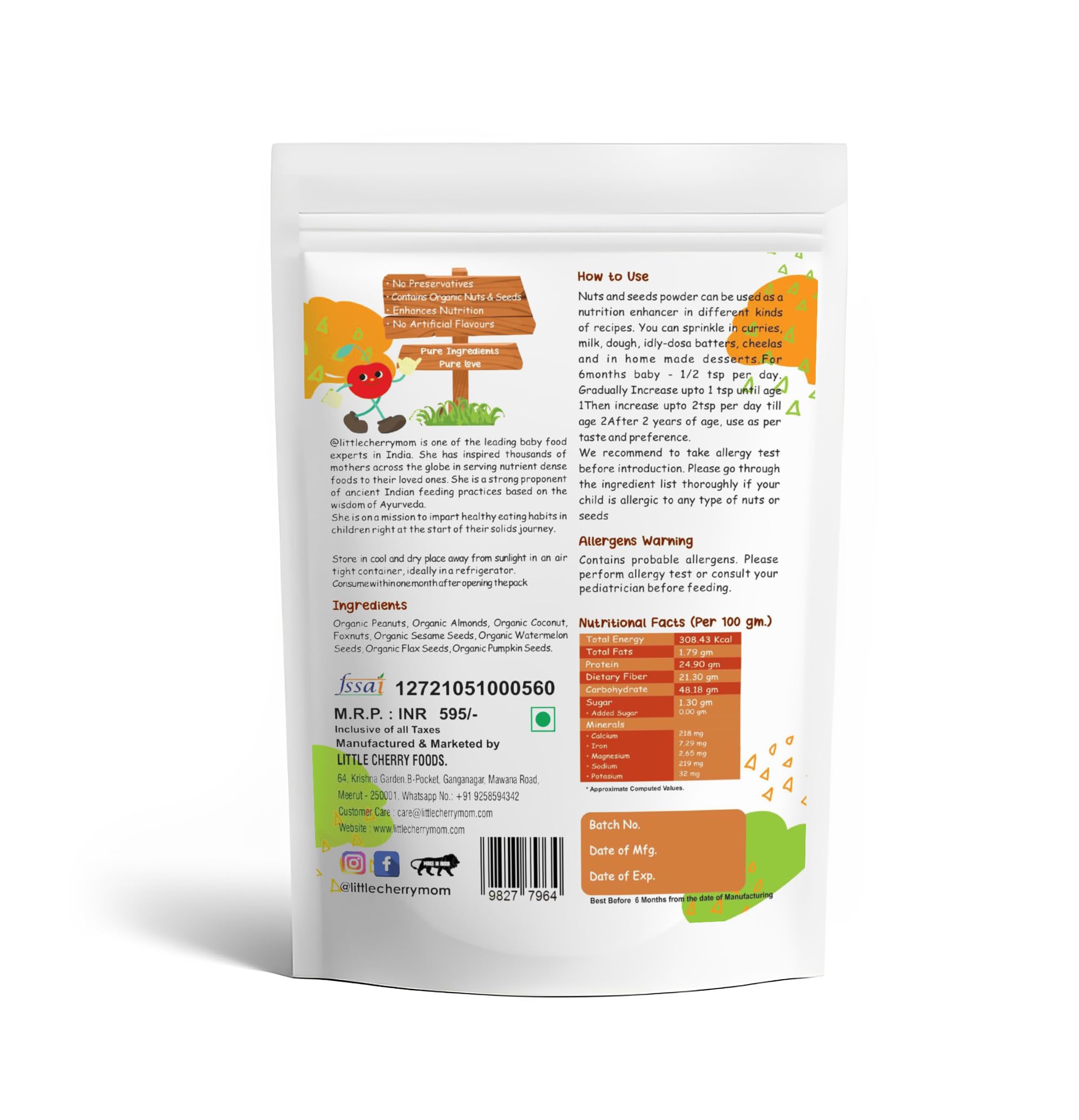 It is a powdered mixture of nuts like almonds, foxnuts(Makhana),Peanuts, coconuts and seeds like watermelon seeds, Flax seeds, Pumpkin seeds and Sesame seeds.