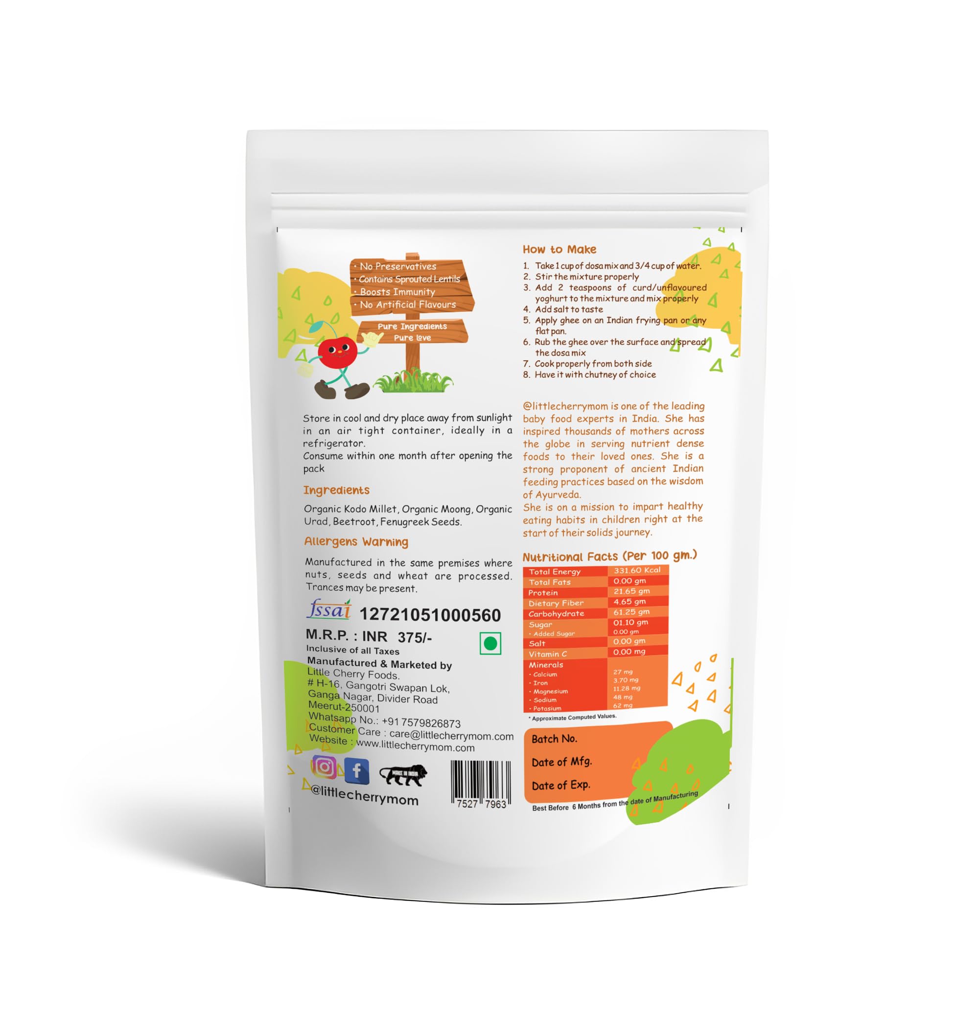 Introducing the Triple Immunity Booster Combo by LittleCherryMom, featuring Amla Powder, Nuts and Seeds Powder, and Kodo Millets Dosa Mix. This combo is designed to enhance your child's immunity and overall well-being. The Amla Powder is rich in Vitamin C and antioxidants, making it perfect for boosting immunity in Indian kids. The Nuts and Seeds Powder contains a combination of essential nuts and seeds, rich in fatty acids and zinc, which are vital for maintaining a good appetite and supporting the growth of babies. The Kodo Millets Dosa Mix improves immunity and addresses stomach-related issues, ensuring your child stays healthy and strong. Give your child the best start with LittleCherryMom's Triple Immunity Booster Combo!