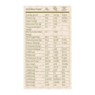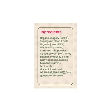 Organic jaggery (33.5%) Supergrain blend ( Oats Organic jowar) (31%) Whole milk powder Skimmed milk powder Cocoa powder (9%) Whey powder Immunity blend (ashwagandhaorganic turmericvitamins &minerals ( zinccalciumironvit D2B1B2B3B5B6B12))GuargumNatural van