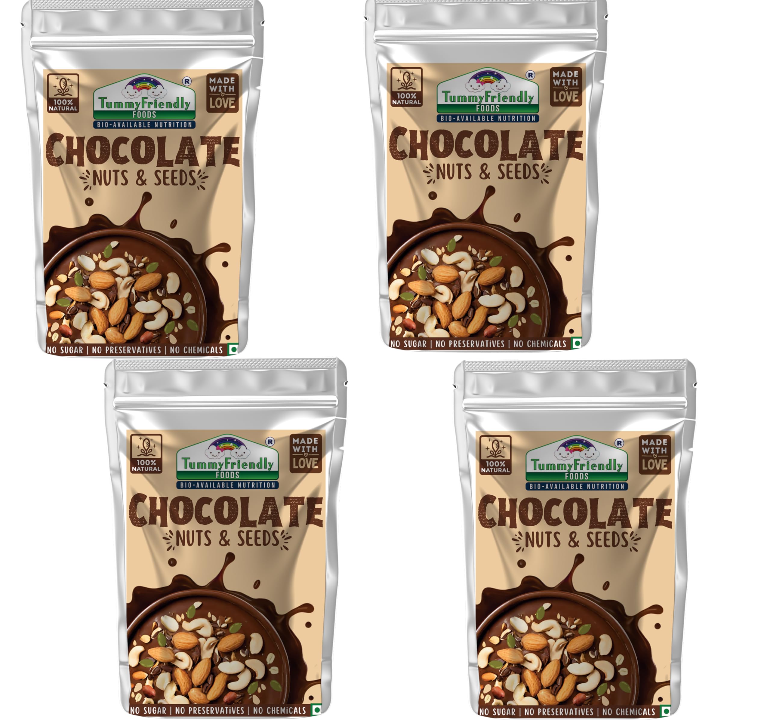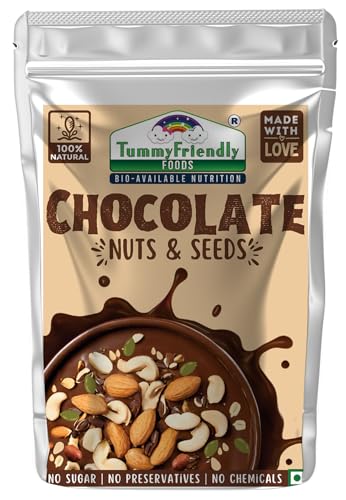 Tummy Friendly Chocolate Nuts and Seeds Mix - 400g - (100g each pack). Healthy Snacks for Kids & adults. Travel Friendly snacks for kids. No Sugar No Chemicals No Preservatives. Introducing our delectable Chocolate Nuts & Seeds specially crafted to be the ultimate nutritious snack for children adults and toddlers alike. Packed with wholesome goodness and bursting with flavor our Healthy Snacks Pack for Kids is perfect for any occasion. Made with a blend of organic nuts and seeds our Nut and Seed Snacks for Children offer a delightful combination of protein-rich ingredients ensuring your little ones receive the energy they need to fuel their adventures. Each bite is a treat for the taste buds delivering a deliciously satisfying experience that kids and toddlers and adults will love. Our Yummy Healthy Snacks for Toddlers are carefully crafted to provide a nutrient-packed boost supporting their growth and development. Not only are our snacks irresistibly tasty but they also offer a range of health benefits. Packed with essential nutrients vitamins and minerals our Immune-Boosting Kids Snacks help strengthen your child's immune system keeping them healthy and happy. For parents seeking gluten-free options our Gluten-Free Kids Snacks are the perfect choice. Whether it's for school lunches or on-the-go snacking our convenient On-the-Go Kids Snacks are individually packaged for easy portability making them ideal for lunchboxes and busy days out. And the best part? Our snacks contain no added sugar ensuring your kids enjoy a guilt-free treat that's as wholesome as it is delicious. Say goodbye to unhealthy snacking and hello to a world of flavor-packed goodness with our Chocolate Nuts & Seeds â the ultimate snack for happy healthy kids. Healthy snacks for kids for school.