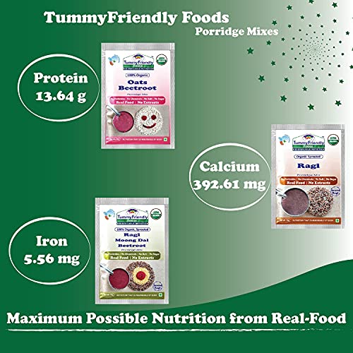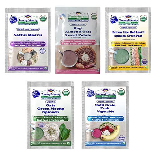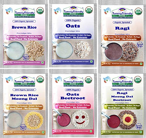 TummyFriendly Foods Certified Organic Sprouted Porridge Mixes | Made of Organic Sprouted Ragi Flour | Shelf-life 6 Month | 6 Baby Packs 50g EachCertified Organic. NO CHEMICAL FORTIFICATION No Sugar No Salt No Milk No Pesticides & No GMO SPROUTS THE LIVING SUPER-FOOD ON THE PLANET. Sprouts are rich in Vitamins Minerals Fibre Anti-oxidants Enzymes Amino-acids and Essential Fatty Acids. When sprouted these little grains & pulses germinate into Baby plants. These Baby plants carry the all nutrients to grow into big plants. In fact Sprouting is Mother-Nature’s way of fortifying the food. Sprouts are also called Sattvic Food. The germination process in Whole Grains eliminates Anti-Nutrients and increases the nutrition levels & their bio-availability significantly. Sprouted Brown Rice is a good source of Gamma-Aminobutyric Acid (GABA) a neurotransmitter that strengthens the central nervous system. Oats are famous for Beta-Glucan a soluble fibre that promotes heart health and healthy gut bacteria. Sprouted Ragi is rich in Calcium and Iron which promote bone growth and overall development. TummyFriendly Foods: Maximum Possible Bio-available Nutrition from Real Food. No extracts no unhealthy ingredients Freshly-made in Small Batches. Can be cooked under 5 min. Sprouted grains so easy to digest. 9 Month Shelf lifeTummyFriendly Foods Certified Organic Sprouted Porridge Mixes Trial Packs With Banana Spinach - Combo3 | Made of Sprouted Ragi Flour Sprouted Brown Rice Flour Oats Banana and Vegetables | Certified Organic Maximum Possible Nutrition From Real Food | No Sugar No Salt No Milk No Chemicals No Pesticides & No GMO | 9 Month Shelf-life | 5 Baby Packs 50g EachSprouted grains are known as the powerhouse of bio-available micro and macro nutrients. Sprouted pulses are rich in Proteins Magnesium Calcium Iron Fibre and Potassium. Sprouting activates the digestive enzymes and helps easy absorption of nutrients. Sprouted Sathu Maavu Porridge Mix is rich in Vitamins Minerals Dietary-Fibre and healthy Fat. Sprouted Sathu Maavu Porridge Mix is a complete food with all the nourishment your little one needs.