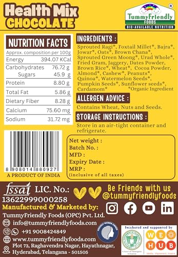 TummyFriendly Foods Organic Chocolate Health Mix For Kids - 300g. Introducing our Organic Multi Grain Health Mix Powder - the ultimate health drink for kids! Crafted with care and packed with goodness this nutritious blend is specially formulated to provide essential nutrients for growing children. Say goodbye to sugar worries! Our health drink for kids without sugar offers a healthy option for parents seeking wholesome alternatives. Made with natural ingredients it's a deliciously healthy choice that kids will love. Created with the well-being of children in mind our health mix for kids is homemade with love. We understand the importance of nourishing your little ones with the best which is why our blend is free from artificial additives and preservatives. Suitable for ages 2-6 years our health mix for kids malt is designed to support their growth and development. With a rich combination of grains it's a powerhouse of nutrients that helps fuel their active lifestyles. Looking for a Healthy Milk Mix powder for kids? Look no further! Our Health mix for kids is the perfect solution. Packed with vitamins and minerals it's an easy and convenient way to ensure your child gets their daily dose of goodness. Make the switch to our Organic Multi Grain Health Mix Powder today and give your kids the gift of health and vitality. With every sip they'll be nourished energized and ready to take on the world!