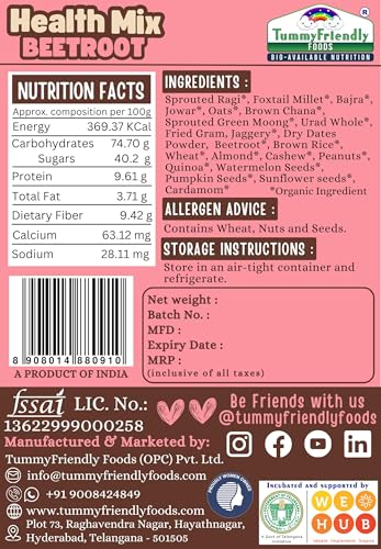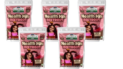 TummyFriendly Foods Organic Beetroot Health Mix For Kids - 300g. Introducing our Organic Multi Grain Health Mix Powder - the ultimate health drink for kids! Crafted with care and packed with goodness this nutritious blend is specially formulated to provide essential nutrients for growing children. Say goodbye to sugar worries! Our health drink for kids without sugar offers a healthy option for parents seeking wholesome alternatives. Made with natural ingredients it's a deliciously healthy choice that kids will love. Created with the well-being of children in mind our health mix for kids is homemade with love. We understand the importance of nourishing your little ones with the best which is why our blend is free from artificial additives and preservatives. Suitable for ages 2-6 years our health mix for kids malt is designed to support their growth and development. With a rich combination of grains it's a powerhouse of nutrients that helps fuel their active lifestyles. Looking for a Healthy Milk Mix powder for kids? Look no further! Our Health mix for kids is the perfect solution. Packed with vitamins and minerals it's an easy and convenient way to ensure your child gets their daily dose of goodness. Make the switch to our Organic Multi Grain Health Mix Powder today and give your kids the gift of health and vitality. With every sip they'll be nourished energized and ready to take on the world!