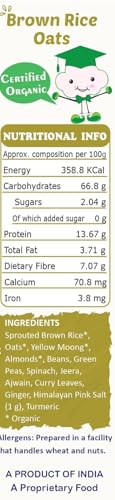 Must try kichkidi for kids and no harmful ingredients. All the ingredients are the best. Rich in Beta-Glucan, promotes heart healthV Ragi is rich in Calcium and Iron which promote bone growth and overall development.The germination process in Ragi is known to multiply the bio-availability of all its Macro & Micro nutrients including Vitamins & Minerals.Almonds are excellent source of Healthy Fat & Folate, crucial nutrients for cell growth during periods of rapid growth.v Oats are famous for Beta-Glucan, a soluble fibre that promotes heart health and healthy gut bacteria.