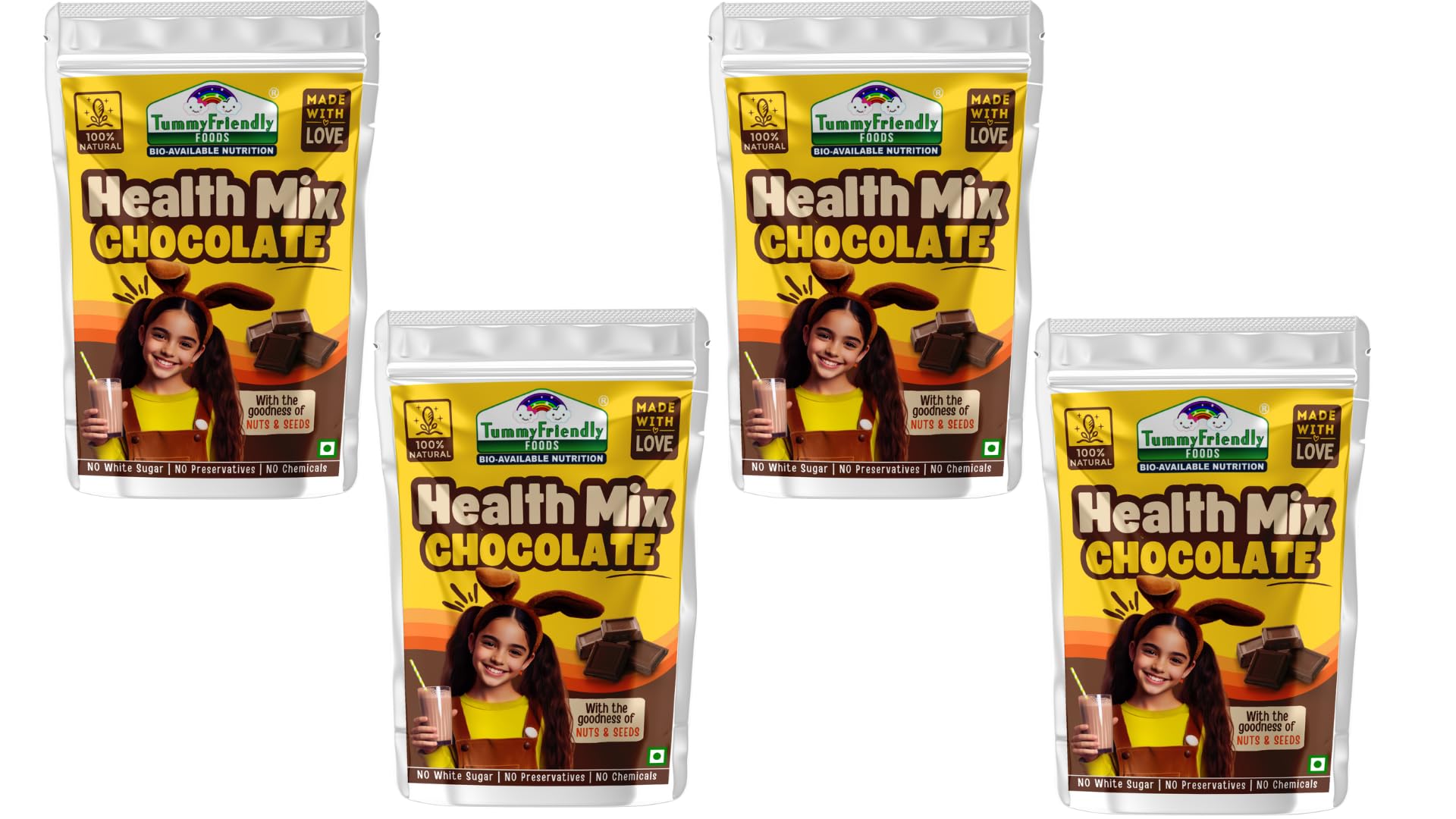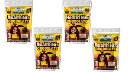 TummyFriendly Foods Organic Chocolate Health Mix For Kids - 400g (100g each pack). Introducing our Organic Multi Grain Health Mix Powder - the ultimate health drink for kids! Crafted with care and packed with goodness this nutritious blend is specially formulated to provide essential nutrients for growing children. Say goodbye to sugar worries! Our health drink for kids without sugar offers a healthy option for parents seeking wholesome alternatives. Made with natural ingredients it's a deliciously healthy choice that kids will love. Created with the well-being of children in mind our health mix for kids is homemade with love. We understand the importance of nourishing your little ones with the best which is why our blend is free from artificial additives and preservatives. Suitable for ages 2-6 years our health mix for kids malt is designed to support their growth and development. With a rich combination of grains it's a powerhouse of nutrients that helps fuel their active lifestyles. Looking for a Healthy Milk Mix powder for kids? Look no further! Our Health mix for kids is the perfect solution. Packed with vitamins and minerals it's an easy and convenient way to ensure your child gets their daily dose of goodness. Make the switch to our Organic Multi Grain Health Mix Powder today and give your kids the gift of health and vitality. With every sip they'll be nourished energized and ready to take on the world!