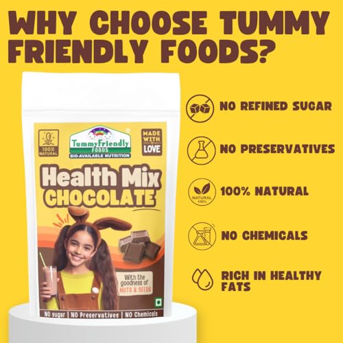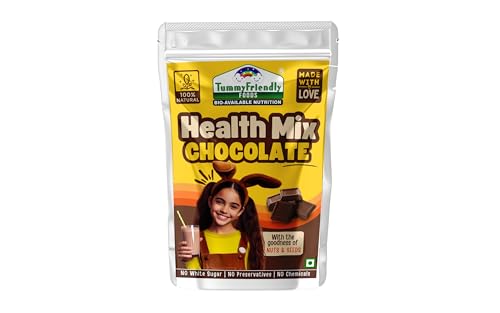 TummyFriendly Foods Organic Chocolate Health Mix For Kids - 500g (100g each pack). Introducing our Organic Multi Grain Health Mix Powder - the ultimate health drink for kids! Crafted with care and packed with goodness this nutritious blend is specially formulated to provide essential nutrients for growing children. Say goodbye to sugar worries! Our health drink for kids without sugar offers a healthy option for parents seeking wholesome alternatives. Made with natural ingredients it's a deliciously healthy choice that kids will love. Created with the well-being of children in mind our health mix for kids is homemade with love. We understand the importance of nourishing your little ones with the best which is why our blend is free from artificial additives and preservatives. Suitable for ages 2-6 years our health mix for kids malt is designed to support their growth and development. With a rich combination of grains it's a powerhouse of nutrients that helps fuel their active lifestyles. Looking for a Healthy Milk Mix powder for kids? Look no further! Our Health mix for kids is the perfect solution. Packed with vitamins and minerals it's an easy and convenient way to ensure your child gets their daily dose of goodness. Make the switch to our Organic Multi Grain Health Mix Powder today and give your kids the gift of health and vitality. With every sip they'll be nourished energized and ready to take on the world!