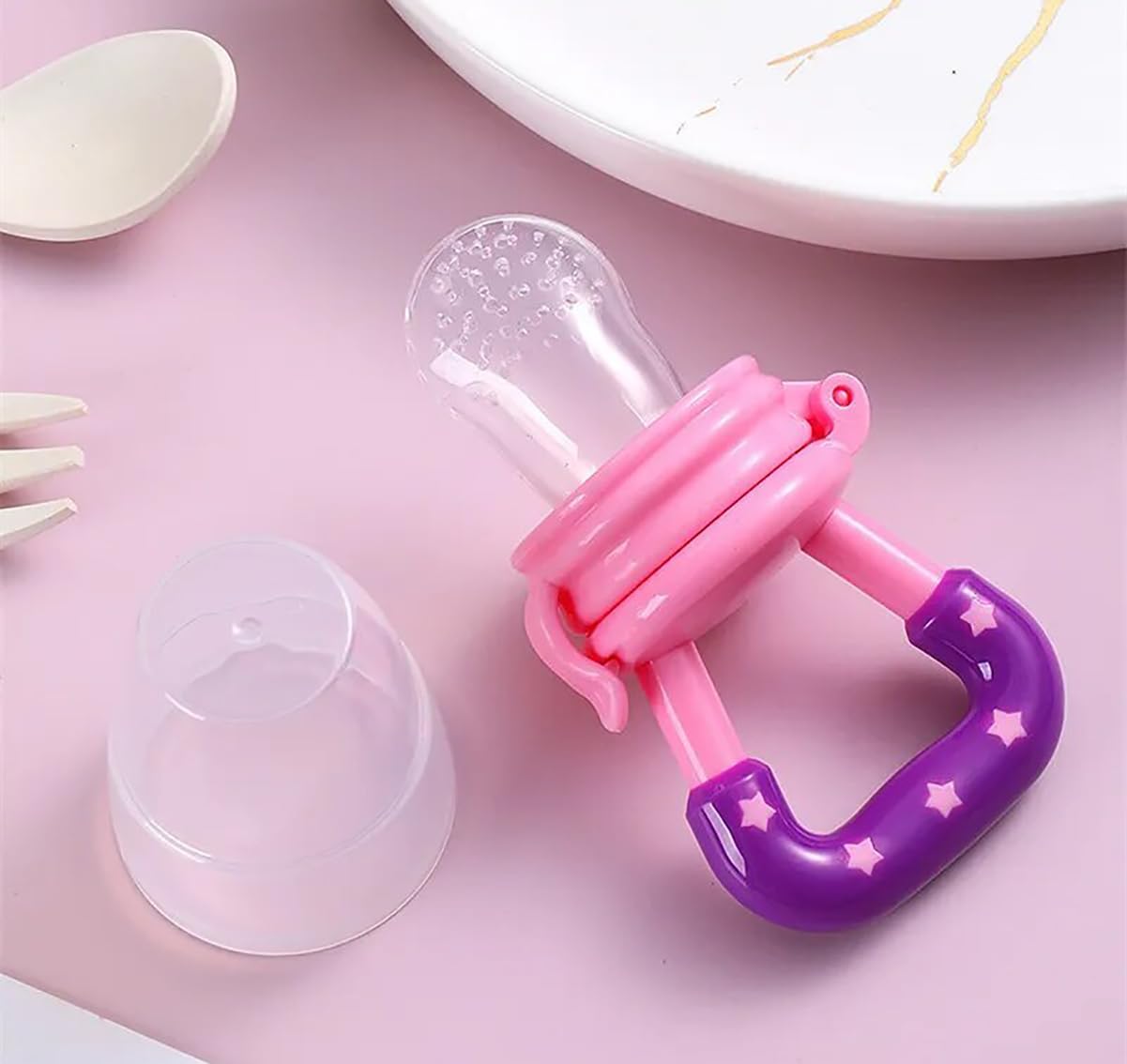 A baby silicone fruit nibbler is a specially designed feeding tool for infants and young children typically aged six months and older. It serves as a safe and enjoyable way to introduce solid foods particularly fruits to babies who are transitioning from breastfeeding or formula feeding to a more varied diet. This innovative feeding device features several key components and attributes:Silicone Material: The nibbler is primarily made from high-quality food-grade silicone which is safe durable and free from harmful chemicals like BPA phthalates and latex. Silicone is easy to clean making it a hygienic choice for baby feeding.Mesh or Teething Nub: The central part of the nibbler consists of a mesh bag or a teething nub which securely holds small pieces of fruits or vegetables. This mesh allows the baby to gnaw chew and suck on the food while preventing choking hazards by ensuring only small digestible pieces pass through.Variety of Flavors: Parents can introduce a wide range of flavours and textures by placing pieces of fresh frozen or steamed fruits into the mesh bag or nub. Common choices include apples pears bananas strawberries and melon. This allows babies to experience different tastes and textures as they explore solid foods.Safety Features: Most nibblers have a secure locking mechanism to prevent accidental opening ensuring the baby's safety during feeding.Mess Reduction: Unlike traditional baby-led weaning a silicone fruit nibbler can help reduce mess and waste as it contains the food within the mesh bag or nub.